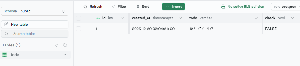필자는 todo와 check 칼럼을 만들어서 테스트해보겠습니다