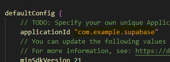 android > app > build.gradle 파일에서 defaultConfig를 변경해 줍니다