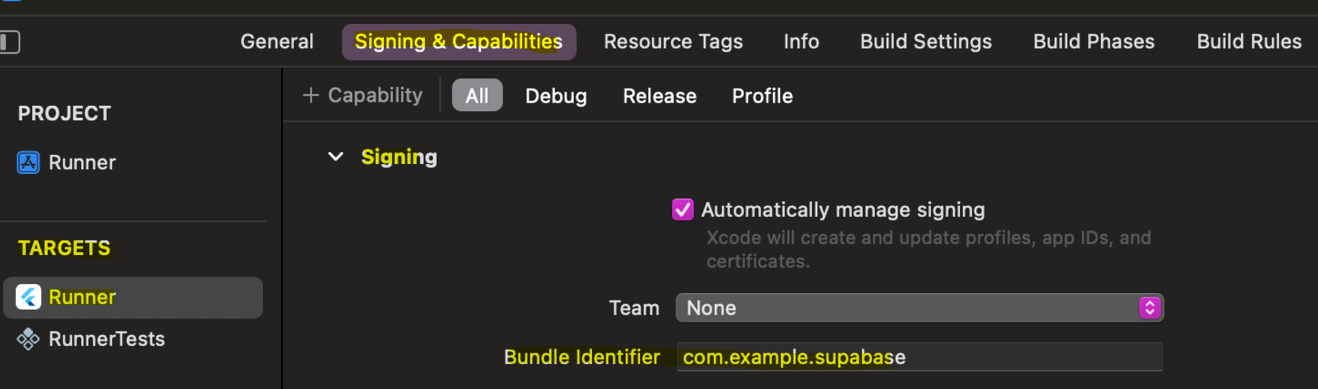TARGET Runner > Signing & Capabilities > Siging > Bundler Identifier에서 변경해 줍니다